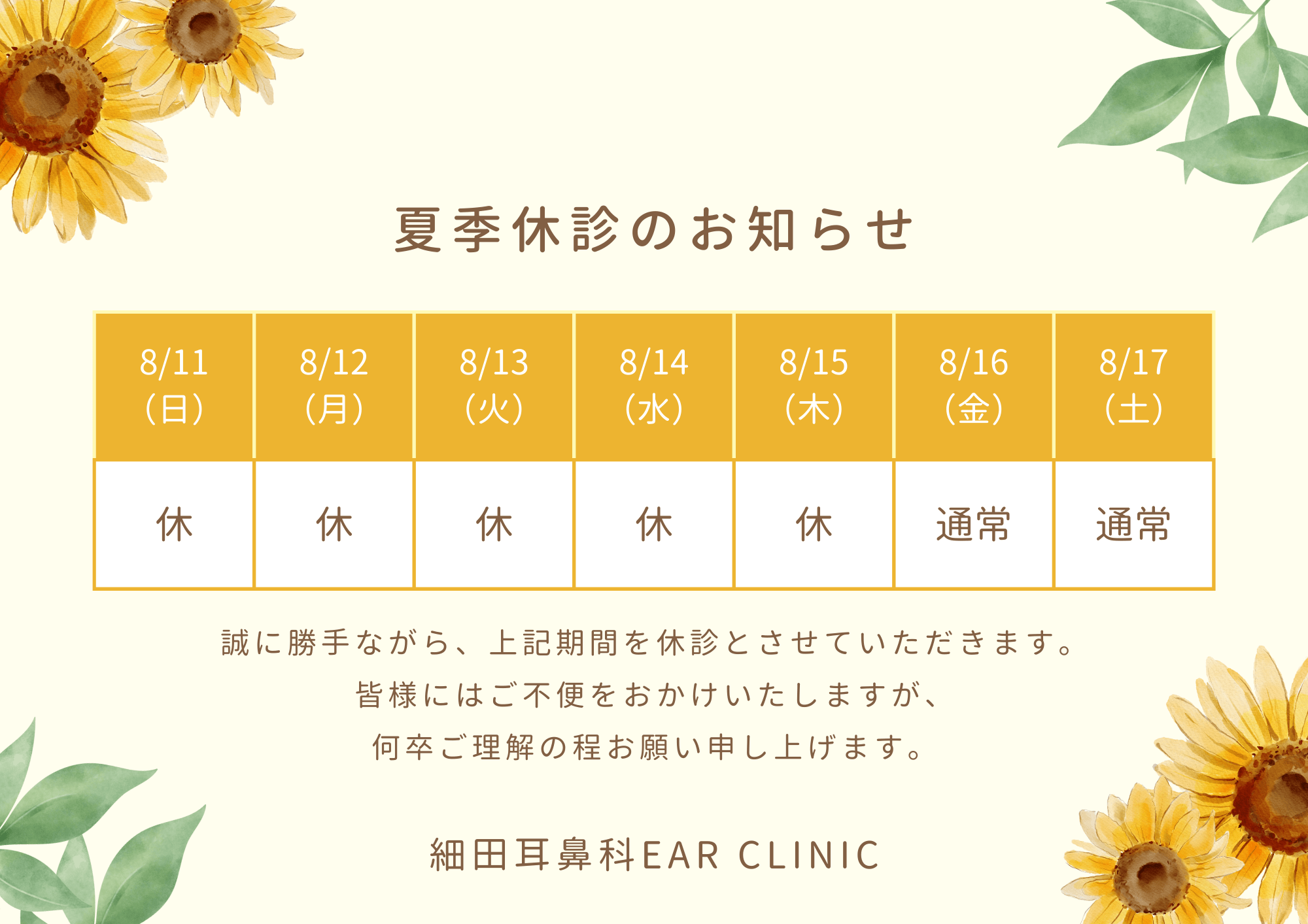 ALL お知らせ 学術活動 プライベート コラム その他 2024年 お盆休み 2024.07.23 お知らせ « 2024年5月GW休診のお知らせ一覧へ戻る 9/26(木) 〜 28(土)学会出席のため休診させて頂きます » 関連する記事 2026.02.04 お知らせ 耳鼻咽喉科医師募集 2025.12.24 お知らせ 2025年度 手術実績を更新しました 2025.12.10 お知らせ 2025-2026年末年始休診のご案内 2025.09.06 お知らせ 9/26(金)〜27(土)学会出席のため休診させて頂きます
