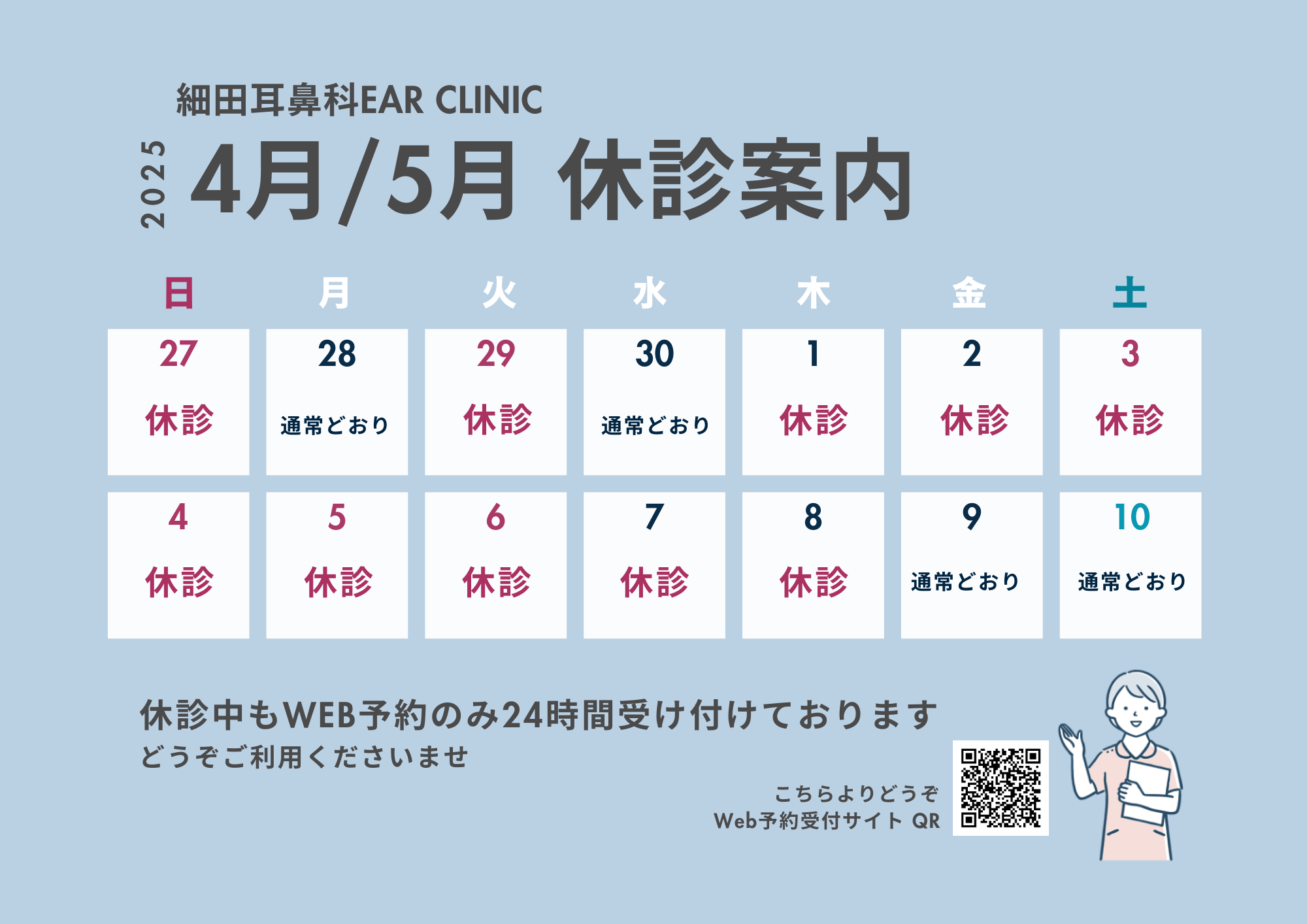 ALL お知らせ 学術活動 プライベート コラム その他 2025年5月GW休診のお知らせ 2025.04.18 お知らせ ご迷惑をお掛けいたしますがよろしくお願いいたします。 ご予約は下記よりお願いいたします。 https://ssc2.doctorqube.com/hosoda-cl/ « 3/24・25・26は手術のみで診察はございません一覧へ戻る 5/27(火)〜30(金)学会出席のため休診させて頂きます » 関連する記事 2026.02.04 お知らせ 耳鼻咽喉科医師募集 2025.12.24 お知らせ 2025年度 手術実績を更新しました 2025.12.10 お知らせ 2025-2026年末年始休診のご案内 2025.09.06 お知らせ 9/26(金)〜27(土)学会出席のため休診させて頂きます