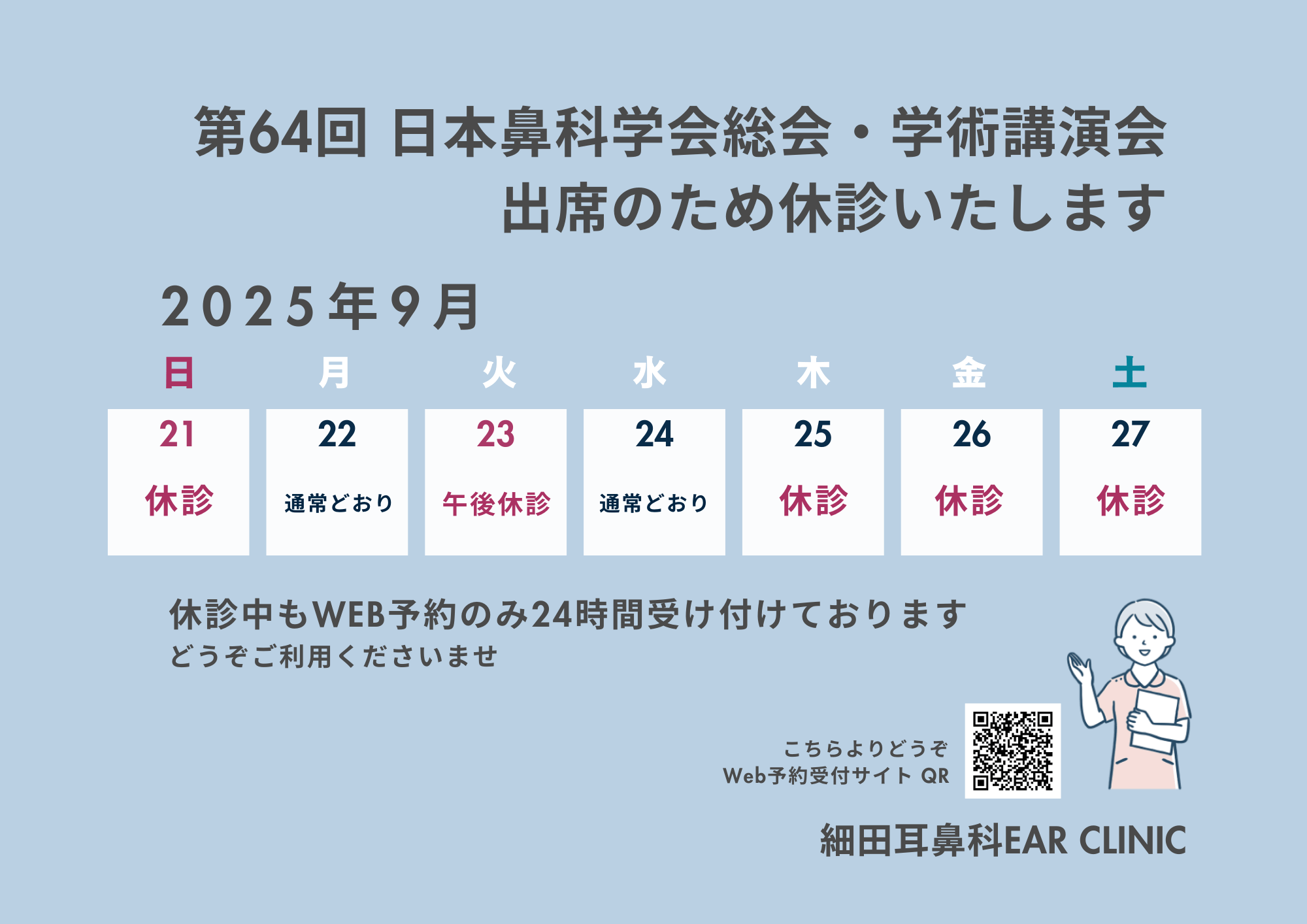 ALL お知らせ 学術活動 プライベート コラム その他 9/26(金)〜27(土)学会出席のため休診させて頂きます 2025.09.06 お知らせ « 2025年 お盆休み一覧へ戻る 2025-2026年末年始休診のご案内 » 関連する記事 2025.12.24 お知らせ 2025年度 手術実績を更新しました 2025.12.10 お知らせ 2025-2026年末年始休診のご案内 2025.08.02 お知らせ 2025年 お盆休み 2025.07.14 お知らせ 第20回耳鼻咽喉科短期滞在手術研究会に発表します