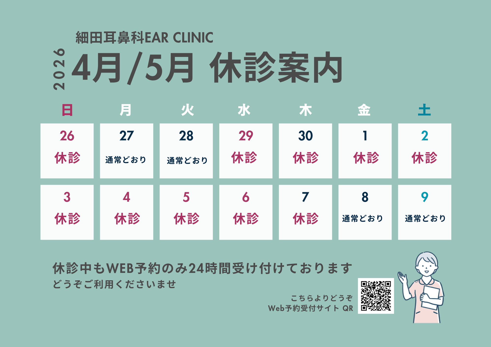 ALL お知らせ 学術活動 プライベート コラム その他 2026年5月GW休診のお知らせ 2026.04.28 お知らせ ご迷惑をお掛けいたしますがよろしくお願いいたします。 WEB予約は24時間受け付けております。 下記よりお願いいたします。 https://ssc2.doctorqube.com/hosoda-cl/ « 耳鼻咽喉科医師募集一覧へ戻る 関連する記事 2026.04.10 お知らせ 耳鼻咽喉科医師募集 2026.03.01 お知らせ 当院における診療体制および加算について 2025.12.24 お知らせ 2025年度 手術実績を更新しました 2025.12.10 お知らせ 2025-2026年末年始休診のご案内
